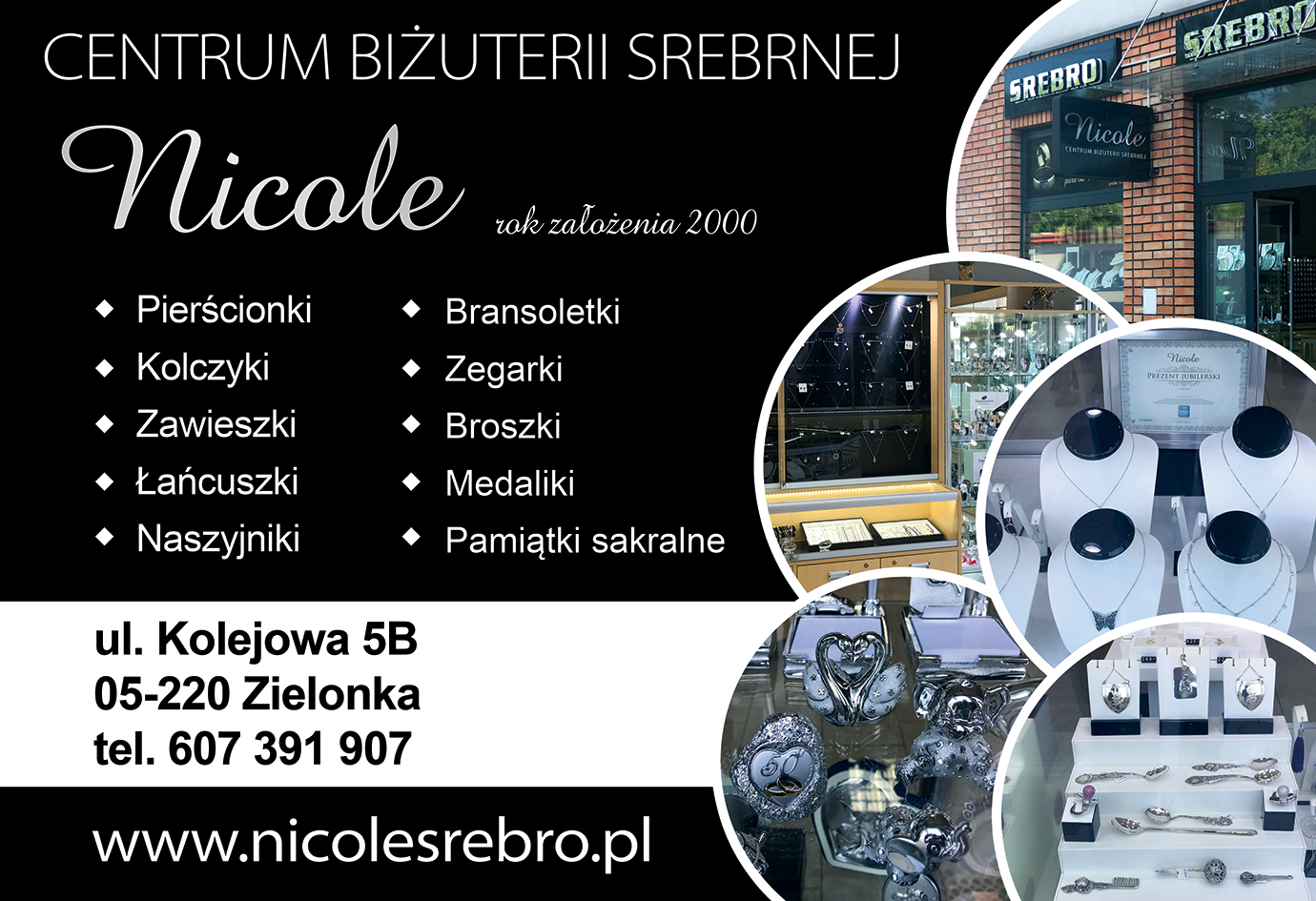 Zapraszamy do naszego sklepu w Zielonce przy ulicy Kolejowej 5B. Posiadamy szeroki wybór biżuterii srebrnej. Nicole to wyjątkowa, dobrze zaprojektowana, starannie i fachowo wykonana biżuteria na każdą okazję. Naszą pasją jest dostarczanie pięknych i niepowtarzalnych rzeczy, dla ludzi ceniących sobie unikalność i dobrą jakość.